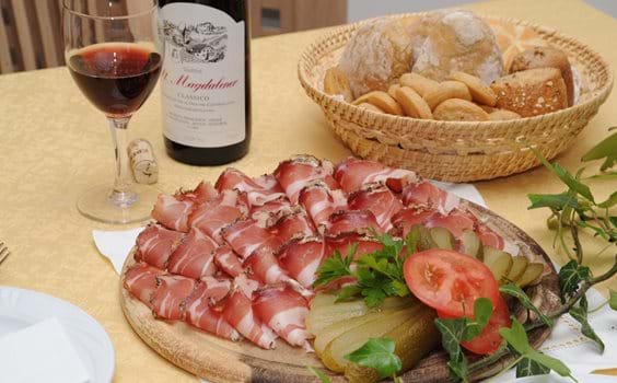 Südtiroler Produkte: einheimische Wurstwaren sowie Bauernspeck, Quark, regionale Käsesorten (Hofkäserei Boarbichl), Naturjoghurt, verschiedene Müsli (Haferflocken, Leinsamen, Kürbiskerne, Sonnenblumenkerne, Studentenfutter).